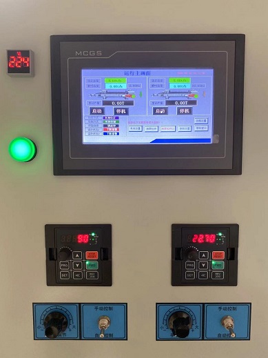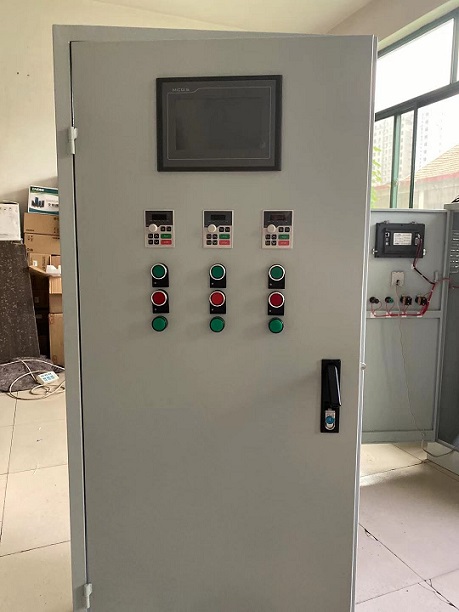 PLC觸摸屏變頻控制柜中包括裝置本體,裝置本體的頂部設(shè)置有頂板,頂板采用軟塑鋼材料制成的,其表面涂有防腐蝕涂料,裝置本體的正面設(shè)置有柜門,柜門表面安裝有液晶觸控屏,液晶觸控屏采用電容屏幕制成,PLC控制器與觸摸顯示屏相連接,傳感器安裝在供水管路上,變頻器與供水泵組相連接。 液晶觸控屏的底部設(shè)置有若干控制按鍵,控制按鍵與裝置本體信號(hào)相連接,裝置本體的底部設(shè)置有底板,底板的下部安裝有減震裝置,減震裝置的底部設(shè)置有底座,裝置本體的右側(cè)面裝設(shè)了警報(bào)燈,警報(bào)燈和裝置本體的信號(hào)相連接,裝置的本體里部裝設(shè)了若干掛板,掛板與裝置本體無縫焊接,掛板表面預(yù)留有若干掛鉤孔, 該P(yáng)LC觸摸屏變頻控制柜控制方便,安全性能越高,通過PLC可以支持遠(yuǎn)程控制,使用效率越高,使設(shè)備運(yùn)行流程及運(yùn)行狀況簡(jiǎn)潔明了、形象直觀,各功能模塊及報(bào)警情況一目了然,方便使用和檢修,節(jié)能效果越加顯明。