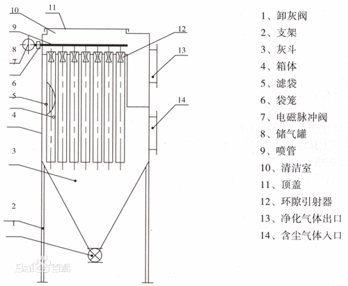 結(jié)構(gòu) 1、上箱體:包括可掀起的蓋板(或緊固式蓋板)和出風(fēng)口。 2、中箱體:包括多孔板、檢修門、濾袋、龍骨、文氏管等。 3、下箱體:包括測(cè)壓接頭等。 4、噴吹系統(tǒng):包括脈沖控制儀、電磁脈沖閥、噴吹管、氣包。 工作原理: 含塵氣體由灰斗(或下部敞開式法蘭)進(jìn)入過(guò)濾室,較粗顆粒直接落入灰斗或灰倉(cāng),含塵氣體經(jīng)濾袋過(guò)濾,粉塵阻留于袋表,凈氣經(jīng)袋口到凈氣室,由風(fēng)機(jī)排入大氣。當(dāng)濾袋表面的粉塵不斷增加,導(dǎo)致設(shè)備阻力上升到設(shè)定值時(shí),時(shí)間繼電器(或微差壓控制器)輸出信號(hào),程控儀開始工作,逐個(gè)開啟脈沖閥,使壓縮空氣通過(guò)噴口對(duì)濾袋進(jìn)行噴吹清灰,使濾袋突然膨脹,在反向氣流的作用下,附于袋表的粉塵迅速脫離濾袋落入灰斗(或灰倉(cāng)),粉塵由卸灰閥排出。全部濾袋噴吹清灰結(jié)束后,除塵器恢復(fù)正常工作。 |
